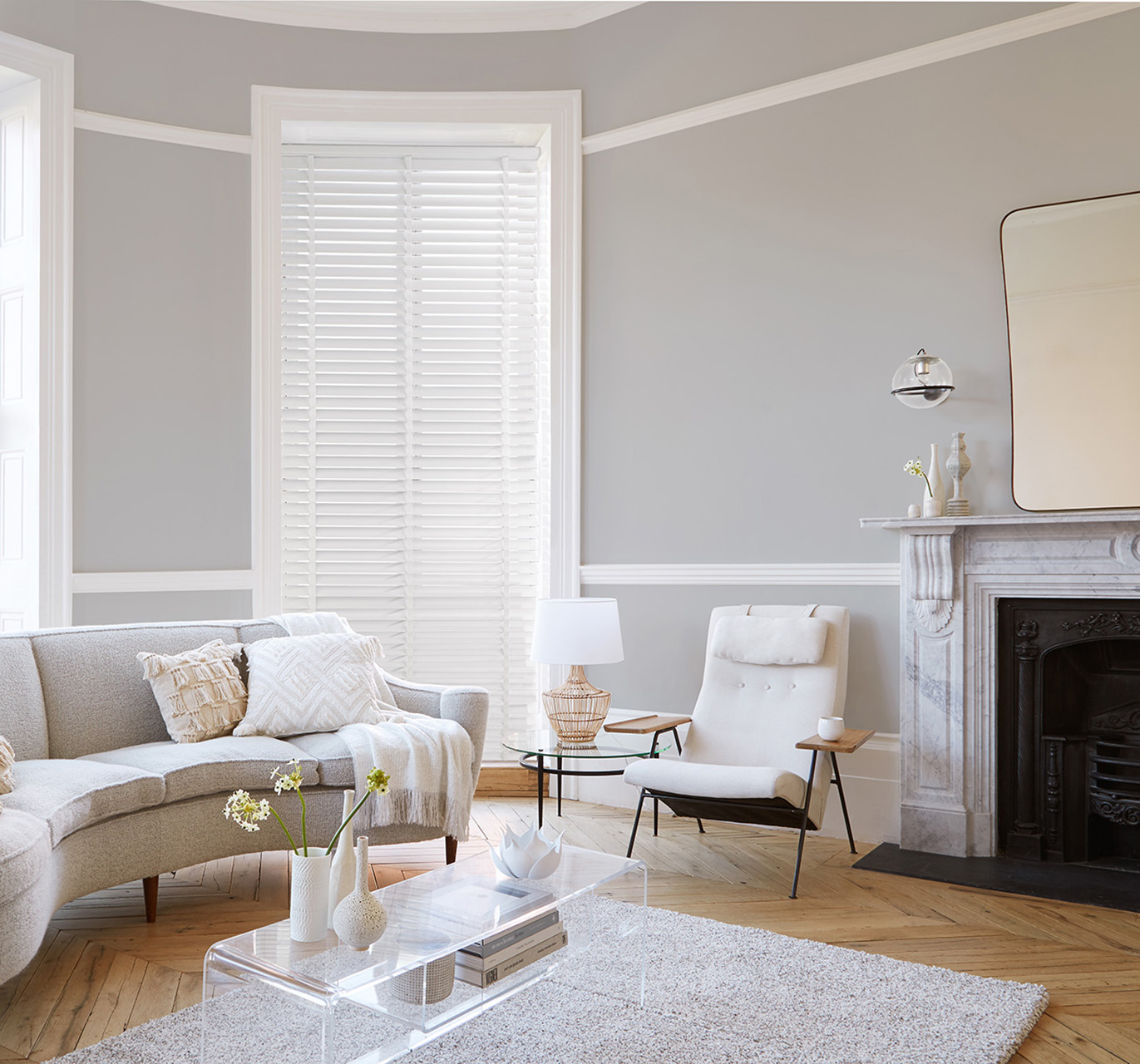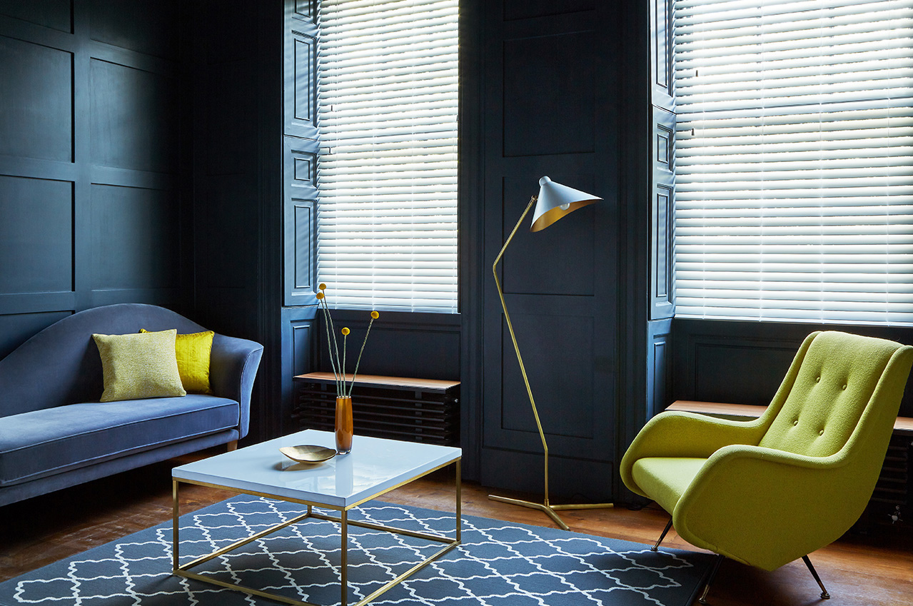 Keep it fresh and crisp at your window with a wooden blind in Bone China. The addition of the blue chair keeps the colourway simple yet effective and the deeper tone actually accentuates the pristine white of the blinds.