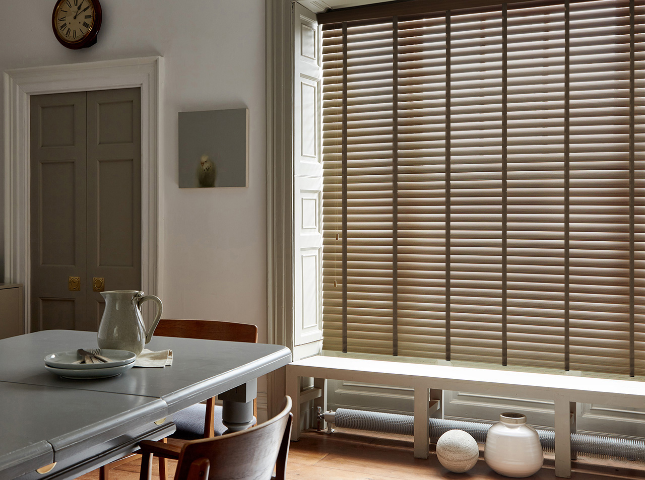 Pristine white Bone China painted wooden blinds give a fresh look, With blinds the same colour as the surrounding walls it creates a sense of increased space as the eye moves over both wall and window together without registering a discernible break to interrupt the flow. Tall but narrow, these windows could have got lost overdressed with curtains or folds of fabric, but the clean lines of the wooden venetians accentuate the height for a streamlined look.