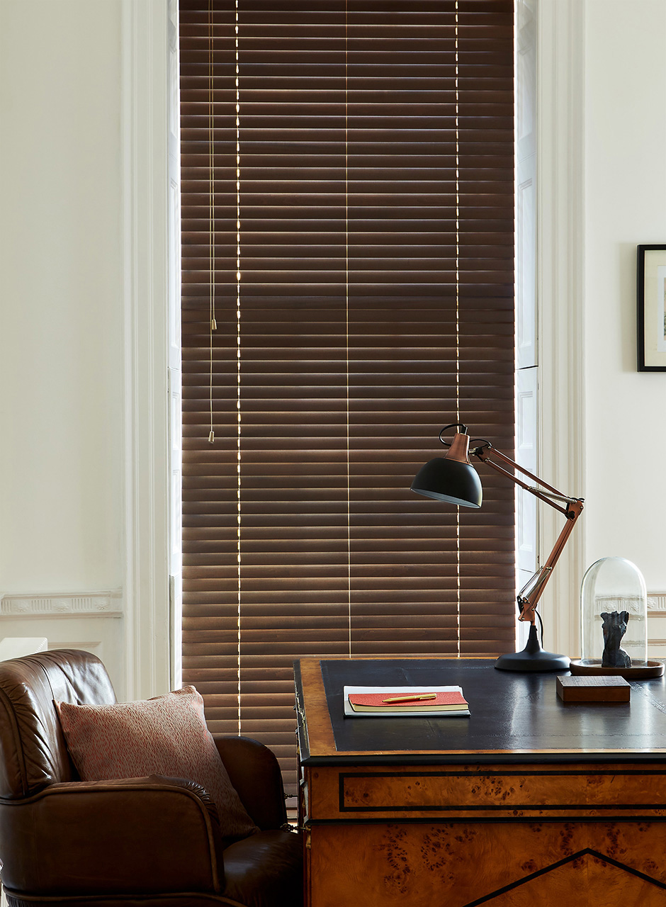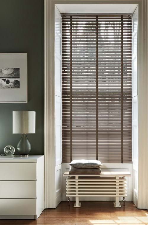 This tall and narrow window offers several challenges, not least with the additional radiator encroaching into the alcove. But by making the challenges more of a feature than an issue, you can create a look that’s suitably bespoke. Wooden blinds in a Shale stain give depth to the alcove, opening up the space for a wider impression, and by choosing a blind that ends at the radiator it presents as a complete unit for a more cohesive look.