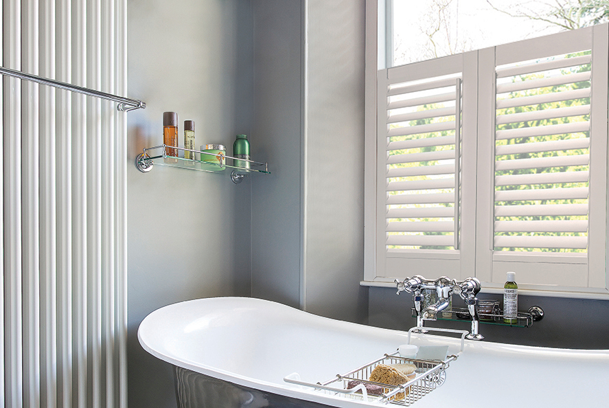 We offer café style shutters in a vinyl option making them an ideal choice for a bathroom. Allowing natural daylight to flow in through the top half of the window gives a spa feel to this bathroom, while the shutters on the lower half afford a high degree of privacy.